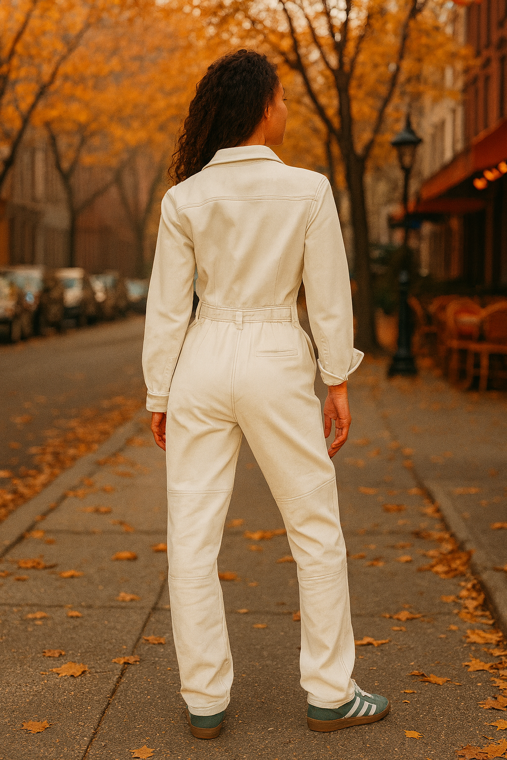 Thaïs ivory denim jumpsuit, long sleeves and front pocket. Fitted waist with elastic at the back to outline the silhouette, cutout at the legs to twist the classic jumpsuit. The perfect piece for the day : with heels for a chic touch, with sneakers for absolute cool.